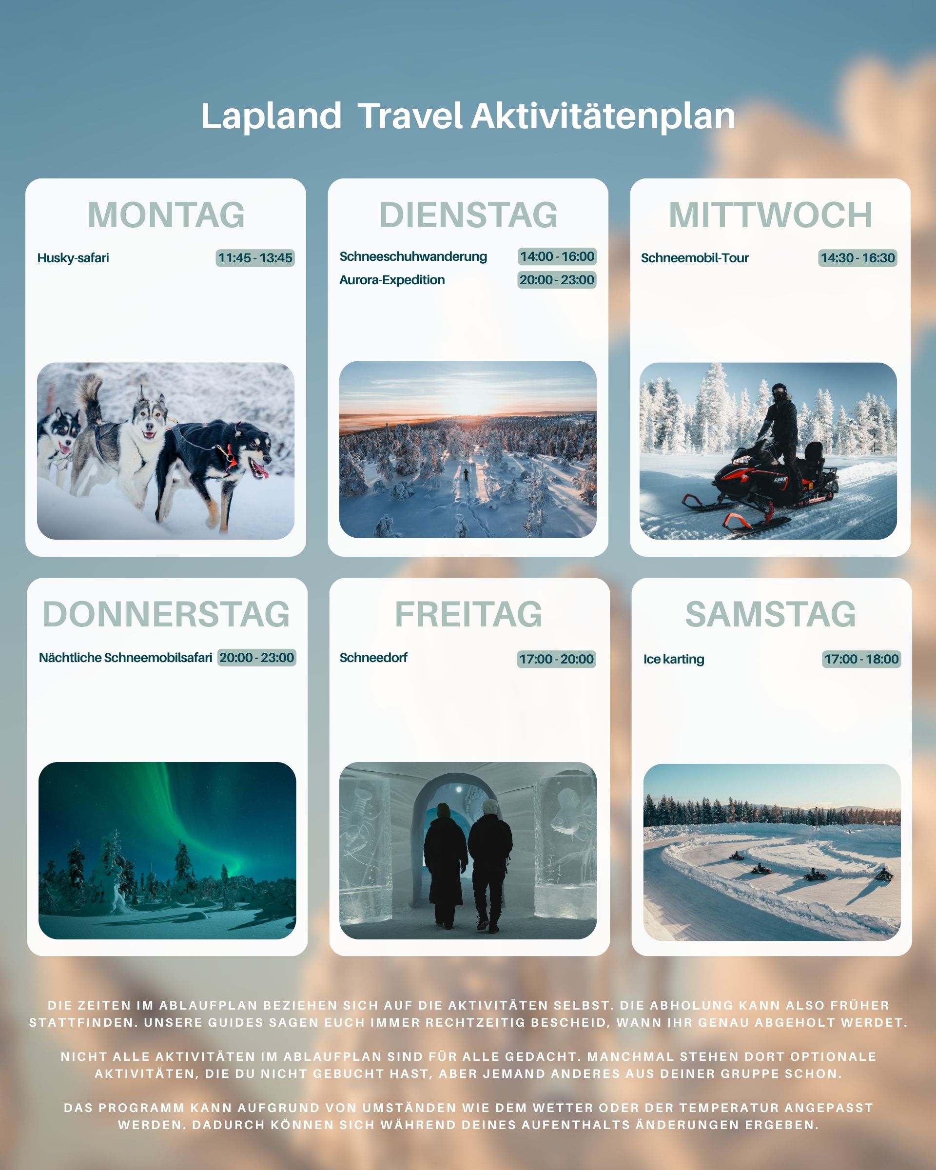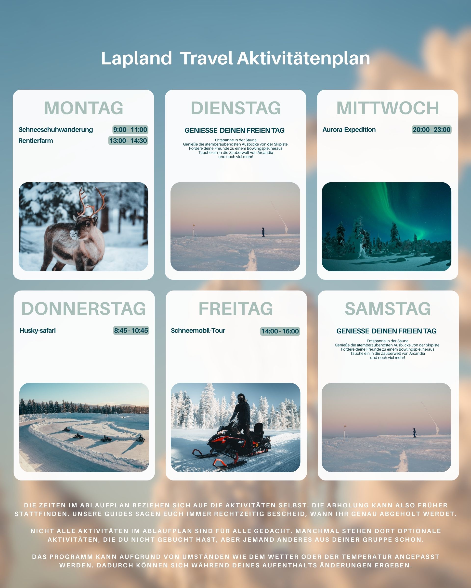 Dieser Wochenplan ist ein Beispiel: er kann sich von Woche zu Woche ändern, je nach den Zeitfenstern, die wir mit unseren lokalen Partnern vereinbart haben. Dennoch vermittelt er dir einen guten Eindruck davon, wie deine Woche in Lappland mit uns und unseren deutschsprachigen Guides aussehen könnte.
